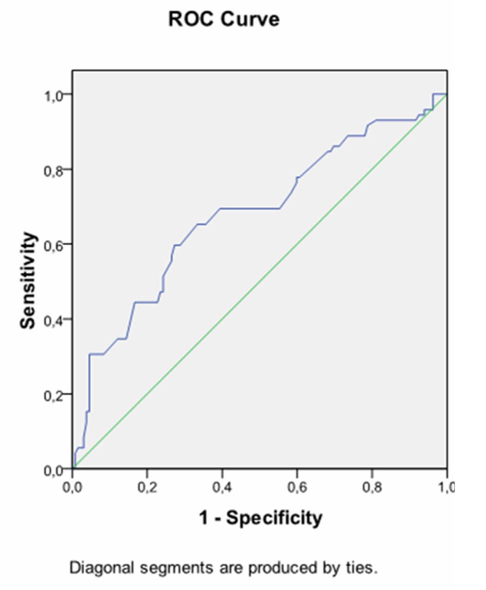 ![]() Click for large image | Figure 1. Receiver operating characteristic curve (ROC) exhibiting fasting plasma glucose during OGTT at prediction of insulin requirement. AUC 0.734, cutofflevel: 89.5 mg/dL, Sensitivity: 72.7% Specifity: 62.6%, P = 0.001. |