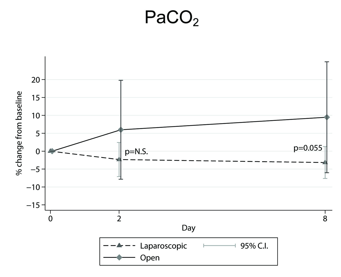 In our study [18] the findings for: 1) the percentage (%) changes from preoperative to second and to eighth postoperative day mean ± SEM (95% CI) (Table 1, 2), and 2) the marginally significant increase (P = 0.055) [18] displayed in OC-PaCO2 values on the eighth postoperative day compared to the LC ones (Fig. 2), are all indicative of a better oxygenation performance for the laparoscopic surgery.