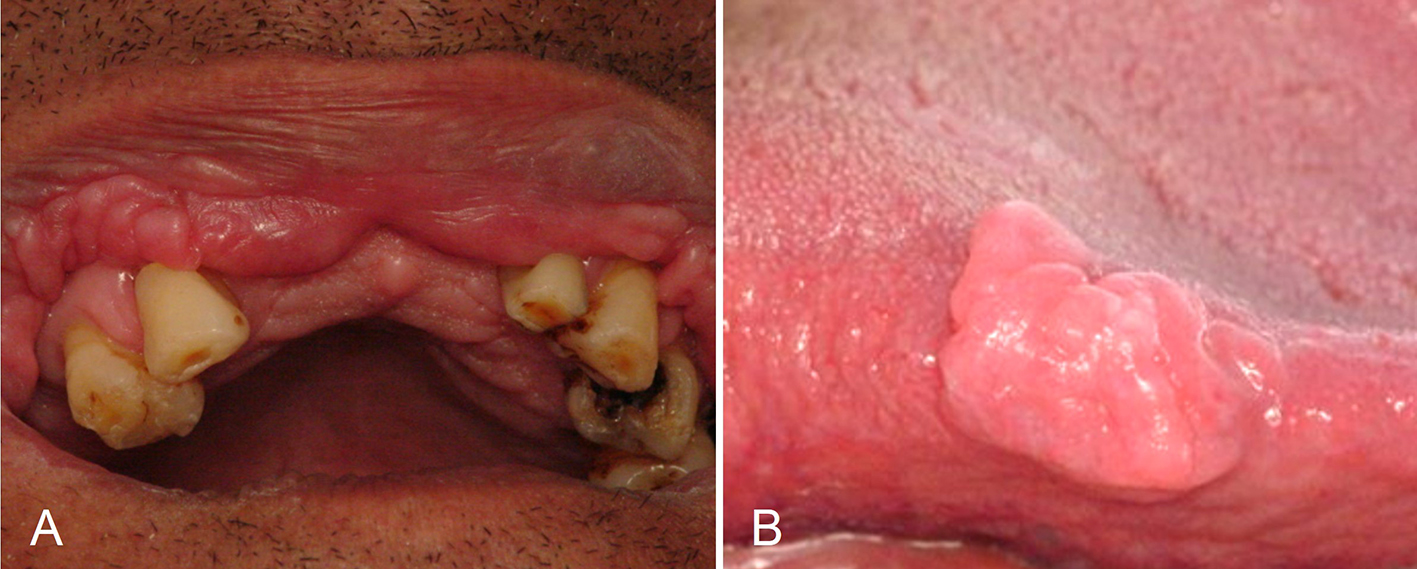 Extraoral examination did not show abnormalities. Intraoral examination revealed multiple lip lesions presenting themselves as normochromic, sessile and scattered papules and nodules, with a tendency to coalesce into plaques yielding double lip appearance (Fig. 1A). On the right tongue border, a large solitary nodule could be seen, measuring approximately 20 mm on its largest diameter, with a sessile, smooth and lobed surface and similar in color to the adjacent mucosa (Fig. 1B).