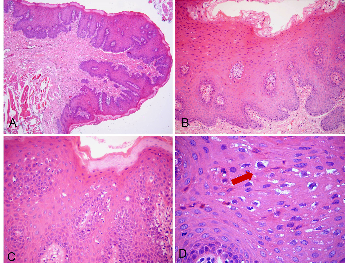 ![]() Click for large image | Figure 3. H&E-stained photomicrographs displaying characteristic features of FEH. Low-power magnification shows pseudocarcinomatous hyperplasia, marked acanthosis and elongated rete ridges (A, × 40; B, × 100). Spinous layer with parakeratosis, anisokaryosis and typical koilocytosis (C, × 200). High magnification allows clearer depiction of koilocytosis showing keratinocytes with pyknotic nuclei, surrounded by clears areas (D, × 400, arrow). |