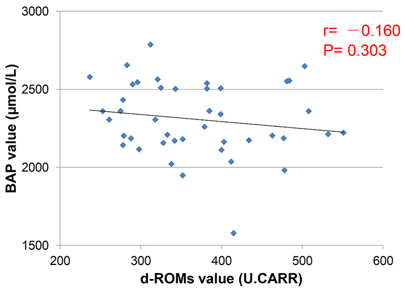Results of the analysis are shown in Figure 4. The d-ROMs value and the BAP value were not correlated. Even when the free radical level increased, the antioxidant potential tended to be preserved.