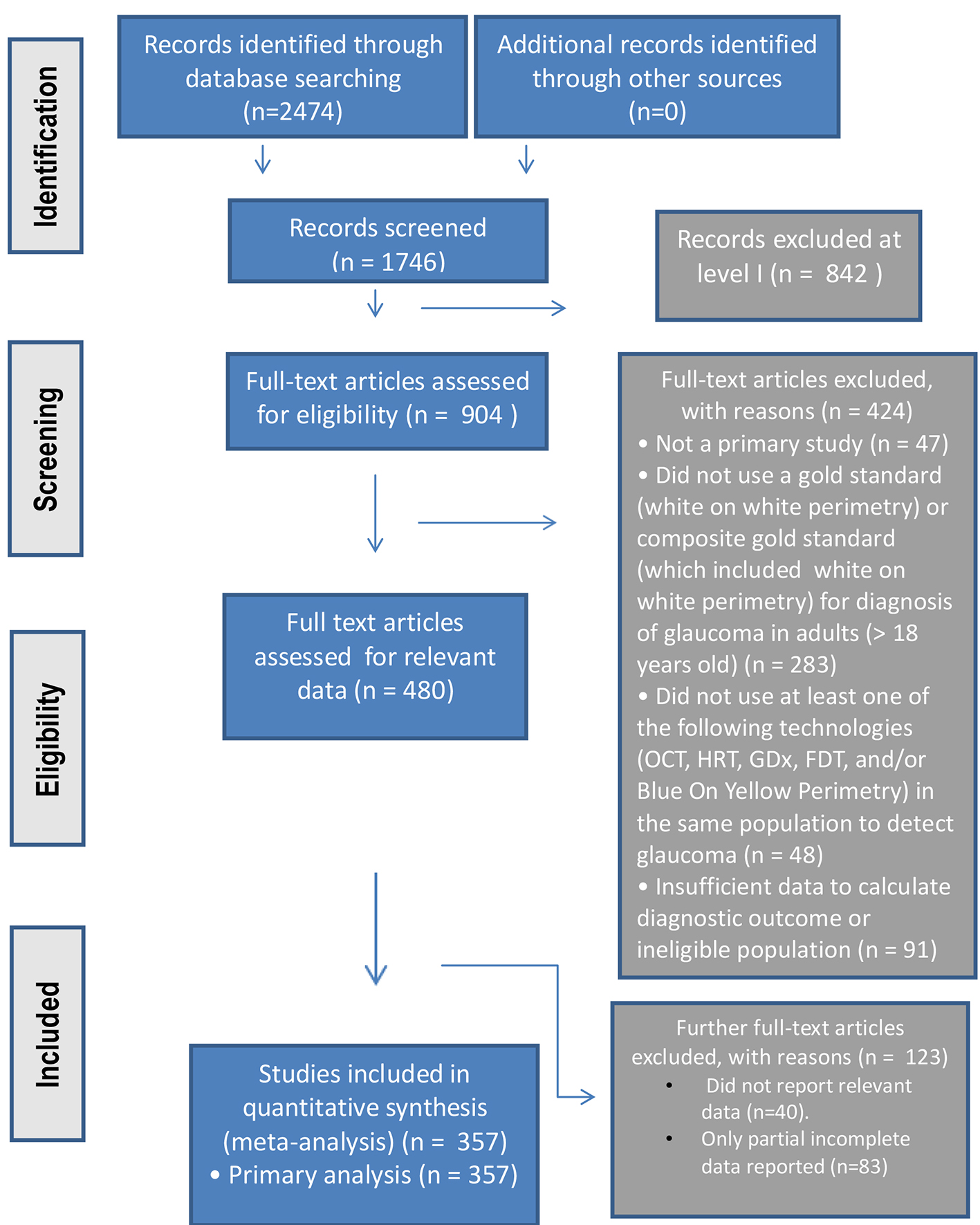 The primary research question addressed the diagnostic accuracies of five index technologies for glaucoma screening: 1) confocal scanning laser ophthalmoscopy (divided into HRT I-II and HRT III); 2) OCT; 3) scanning laser polarimetry; 4) blue on yellow automated perimetry; and 5) FDT.