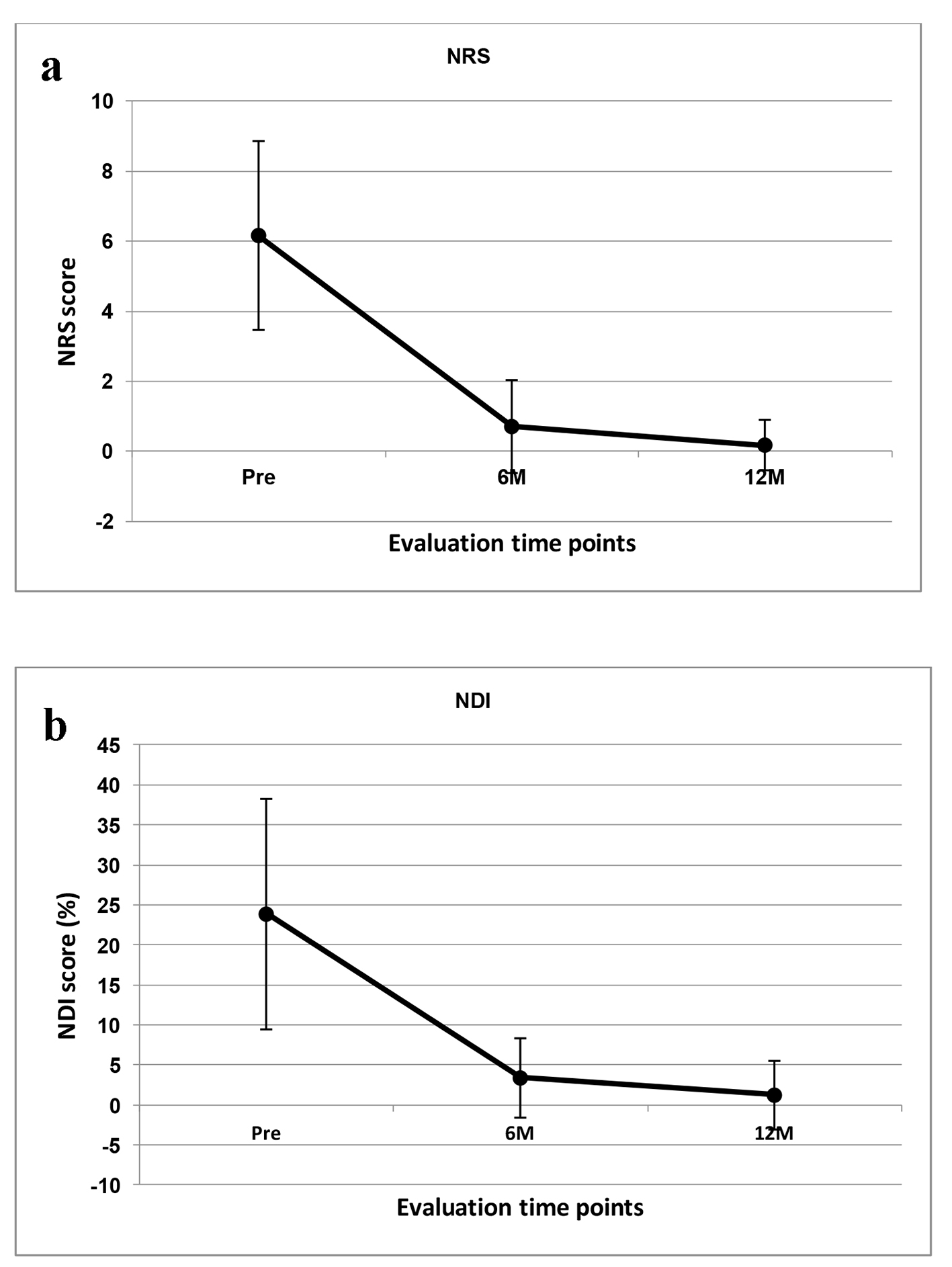 ![]() Click for large image | Figure 1. Line graphs illustrating: (a) the pain NRS mean scores and (b) the NDI mean scores preoperatively and then at 6- and 12-month time points. There was significant difference between time points for both instruments. |