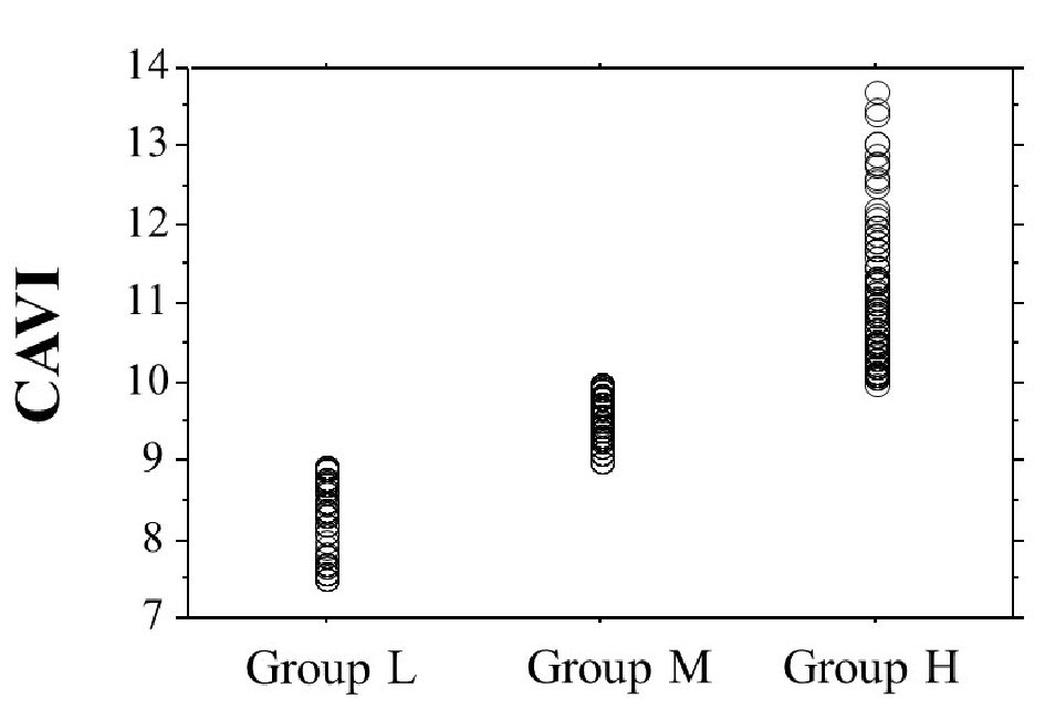 Results: During the follow-up period (median 60.1 months), major adverse cardiovascular events (MACE) occurred in 91 cases (L, 8 (8.0%); M, 31 (15.6%); H, 52 (32.3%); P < 0.001, log-rank test). On multivariate Cox regression analysis, the risk for a MACE was significantly higher in group H than in non-group H (hazard ratio, 2.04; 95% confidence interval, 1.31 - 3.02; P < 0.01). A CAVI cut-off of 9.7 yielded the largest area under the curve, 0.701 (95% confidence interval: 0.657 - 0.743, P < 0.001), indicating a sensitivity of 74.0% and a specificity of 59.6% for discriminating between those who did and did not experience a MACE during follow-up.