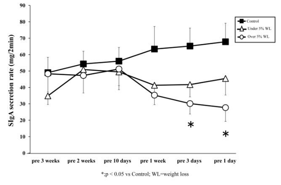 Results: The over 5% body weight loss group had significantly lower SIgA secretion rates on the first day and third day before the real competition compared to those of the control group. Furthermore, the over 5% body weight loss group had an increased number of symptoms of upper respiratory tract infections. Alterations in mental statuses were also seen, such as decreased vitality and increased fatigue on the day before the competition in the over 5% weight loss group.
