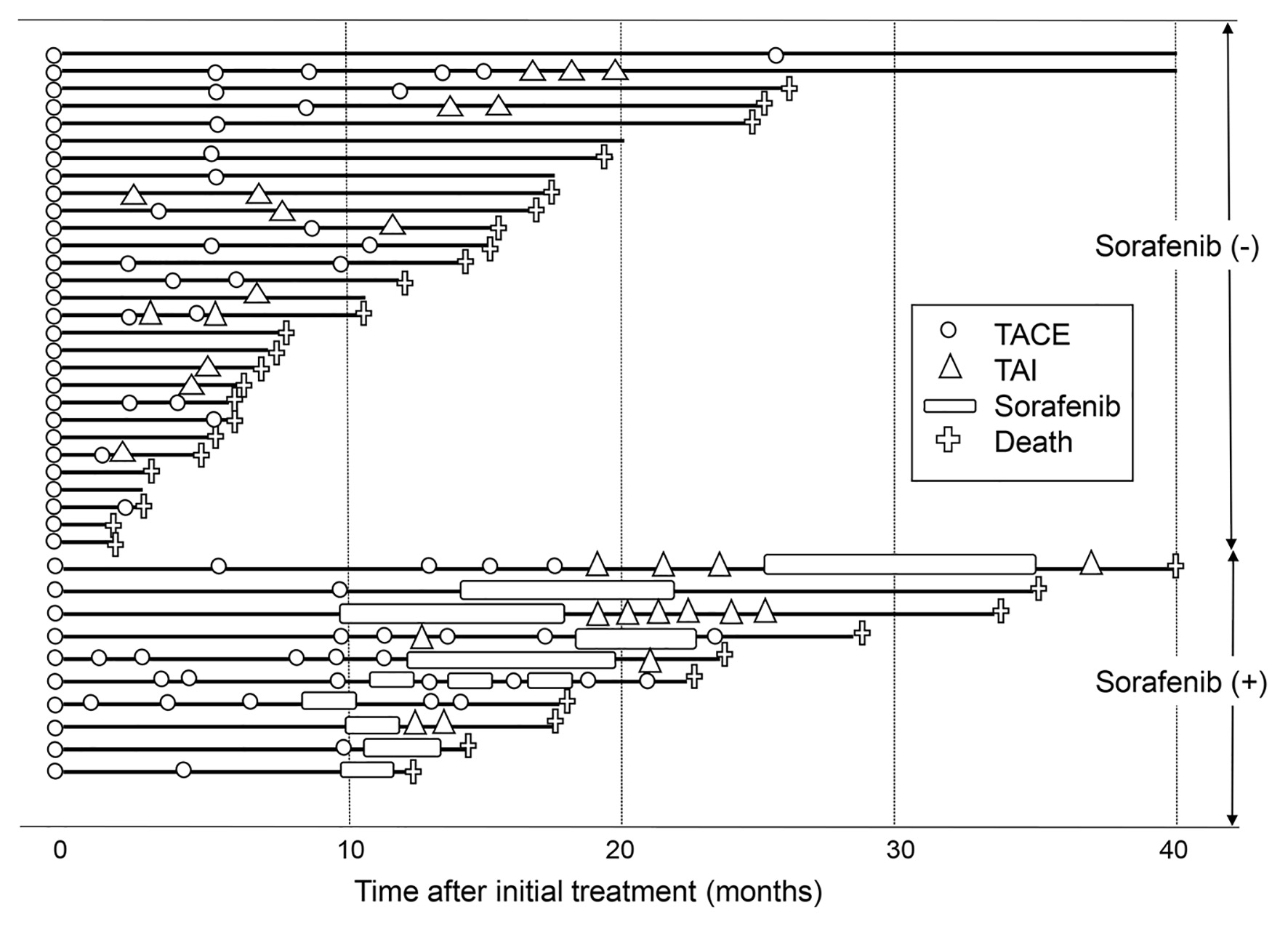 ![]() Click for large image | Figure 3. Subsequent treatment course of the 39 patients who underwent TACE as an initial treatment. The solid line denotes the survival time of patients, and the crosses denote deaths. The open circles and open triangles denote TACE and TAI treatments. The open boxes denote sorafenib administration. Patients who received sorafenib are shown in the lower part, whereas patients who did not are shown in the upper part. TACE: transarterial chemoembolization; TAI: transarterial infusion chemotherapy. |