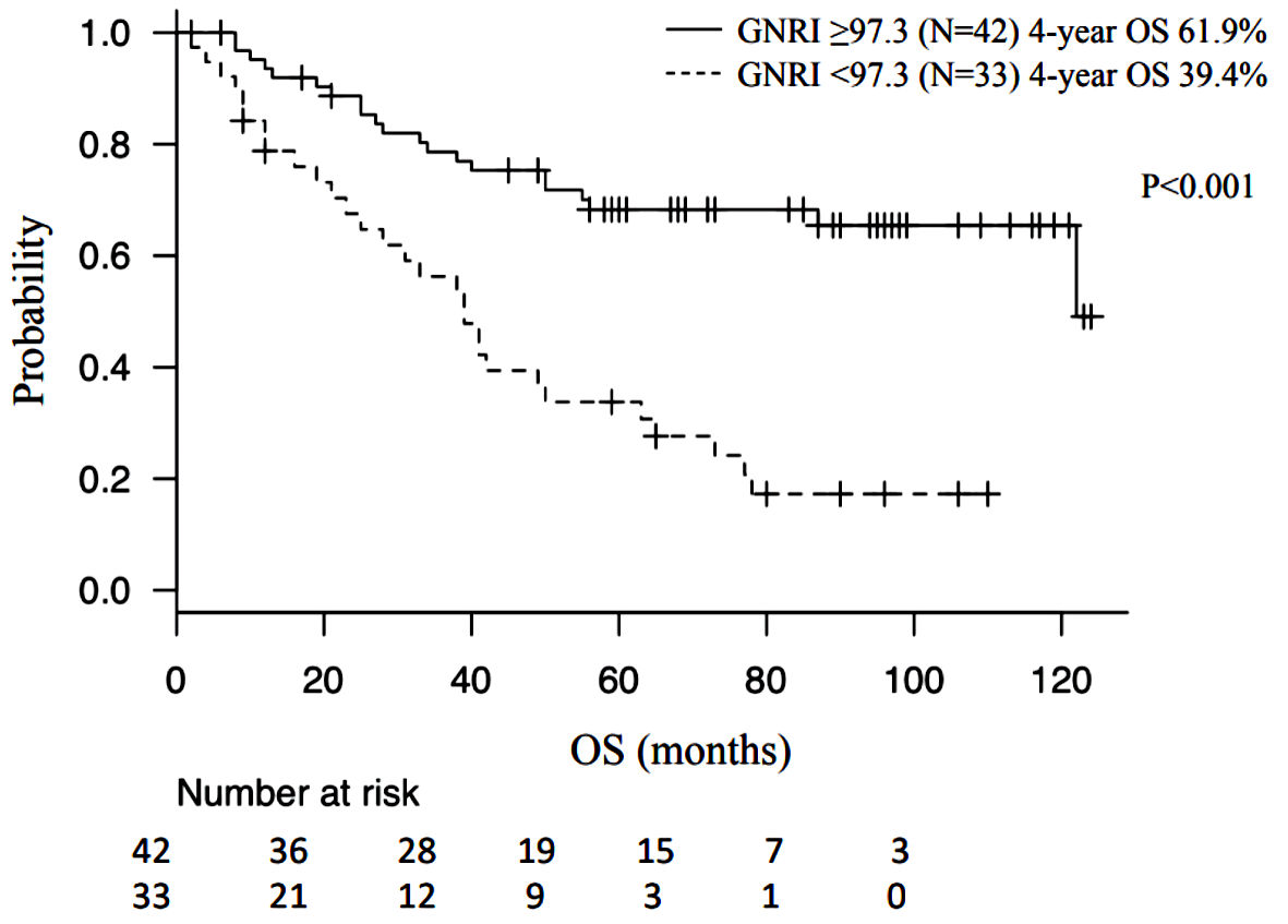 ![]() Click for large image | Figure 1. Kaplan-Meier curve and log-rank test. GNRI: geriatric nutritional risk index; OS: overall survival. |