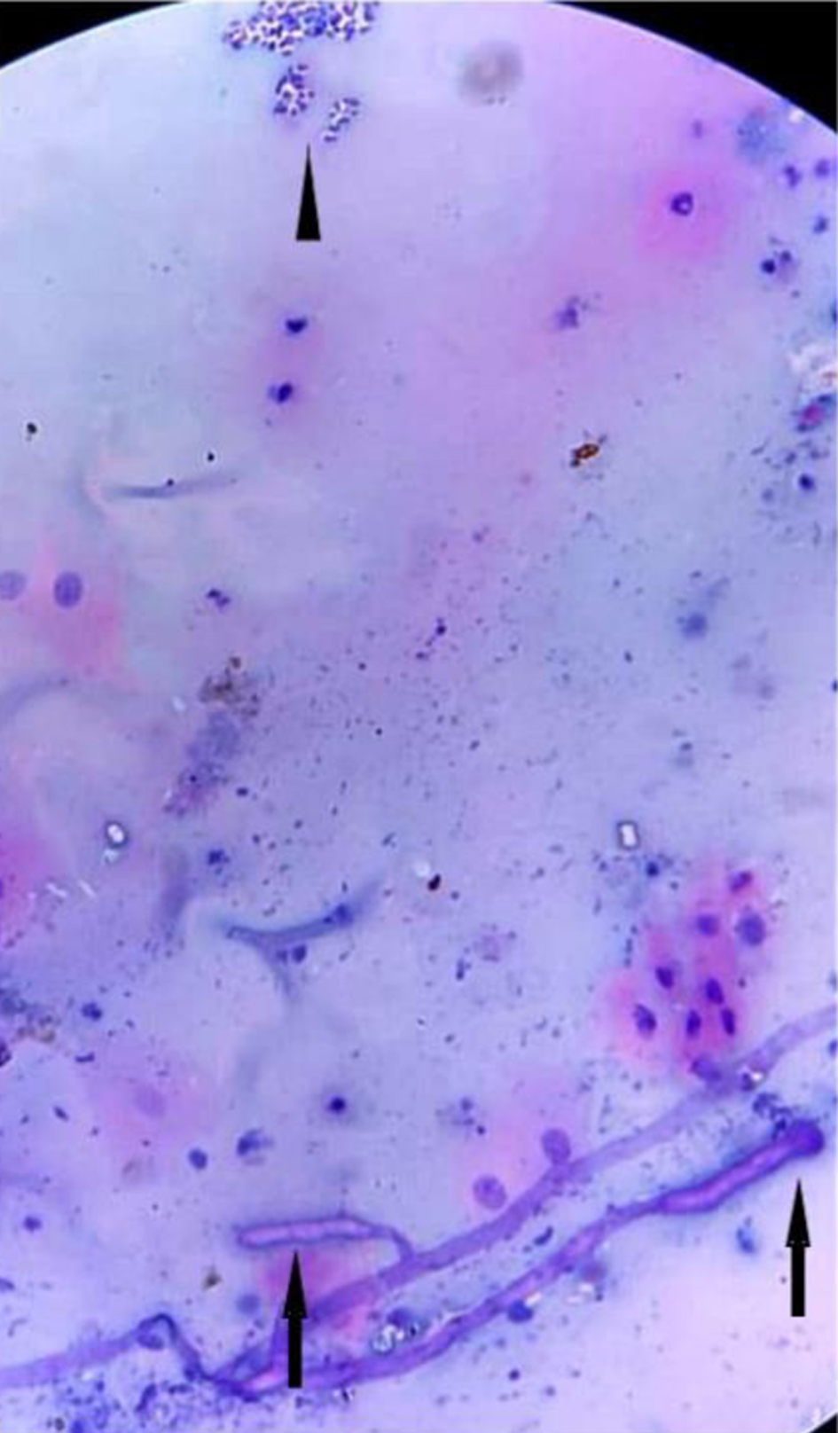 After the initial diagnosis, the patients were managed according to the clinical protocol which included antifungal therapy and surgical debridement of involved tissue. Intravenous lipid formulation of amphotericin B was the drug of choice for initial therapy. Posaconazole and isavuconazole were also used as step down therapy after adequate response was achieved [11]. Some post-therapeutic biopsy samples were also received after 5 - 7 days of antifungal therapy. These samples were also evaluated cytologically by preparing crush smears. All the afore-mentioned methods were carried out in accordance with relevant standard guidelines and regulations. The study was carried according to the Declaration of Helsinki. All the experimental (cytopathological) protocols were approved by the J.N. Medical College Institutional Committee.