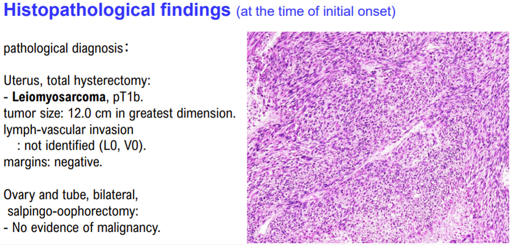 She was subsequently diagnosed with uterine leiomyosarcoma stage Ib on pathological examination (Fig. 1). The initial treatment was completed using the surgical treatment recommended by clinical guidelines, including the National Comprehensive Cancer Network®. Following hospital discharge, she was followed up on an outpatient visit.