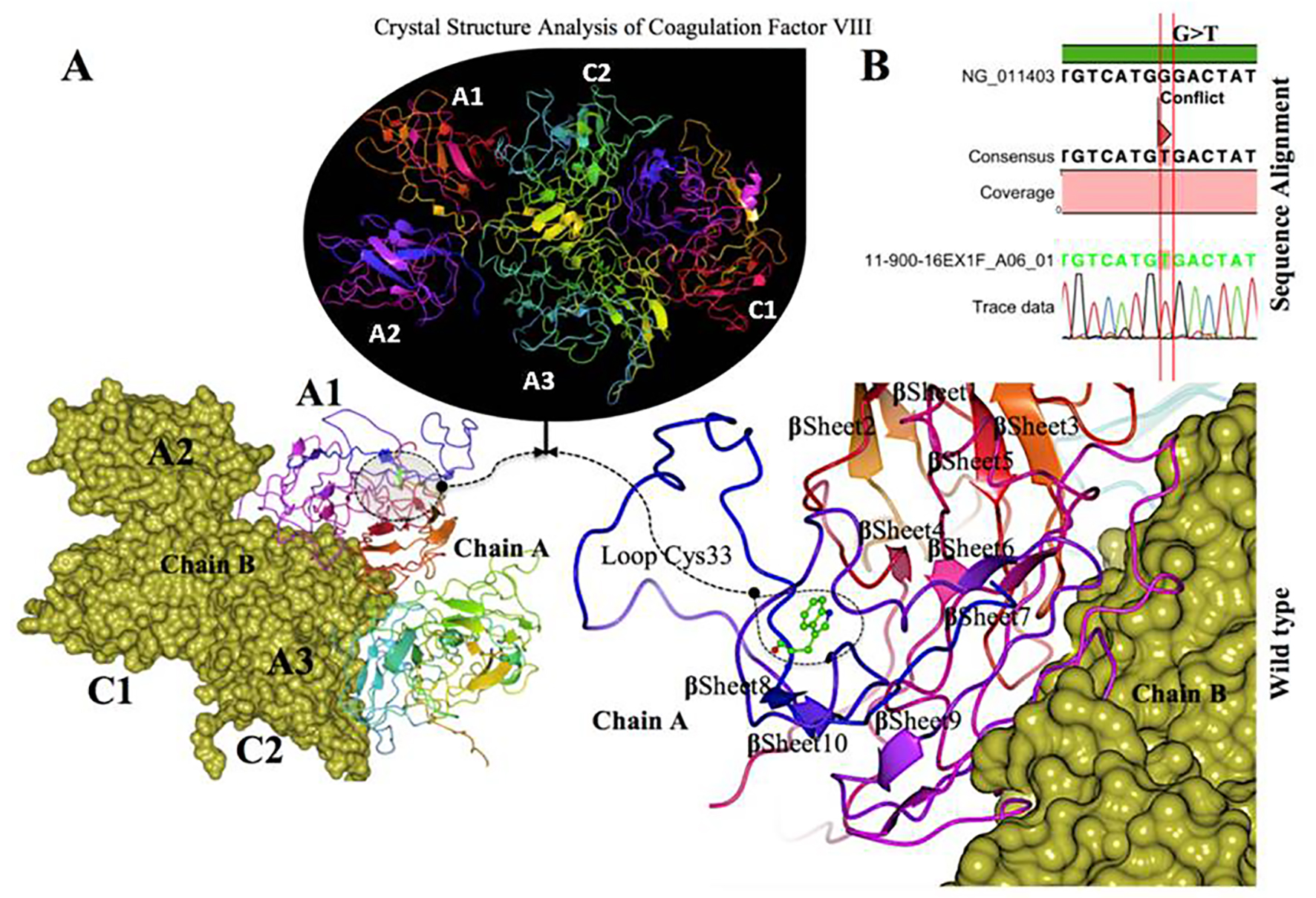 Figure 5. Crystal structure of coagulation domains of hemophilia factor VIII protein and MD simulation. (A) The crystal structure of the domains of factor VIII (PDB ID 2R7E), the individual domains are labeled and also in different colors (A1) in magenta, (A2) shown in blue, (A3) shown in yellowish green, (C1) shown in pink, and (C2) shown in bluish green. The molecular surface of factor VIII domains (A2) and (A3) are in chain B (yellow). Overview views positions of mutation with nearby residues shown as ball and stick models in dashed circle. The (Try33Cys) mutation located in the interface of (A1) domain, a tertiary structure of the wild type chain A of factor VIII protein showing the mutation (W 33 C) green on a loop region near with alpha helix 10. (B) The electrophoregram showing the sequence alignment the patient sample with the wild type for this mutation G>T.